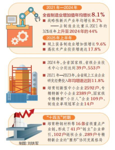 統(tǒng)計數(shù)據(jù)顯示,2021年—2024年,全省制造業(yè)增加值年均增長8.1%,戰(zhàn)略性新興產(chǎn)業(yè)年均增長8.7%,占制造業(yè)比重從2021年的32%逐年上升至2024年的44%。2025年上半年全省規(guī)上裝備制造業(yè)增加值增長9.6%,高技術(shù)產(chǎn)業(yè)投資增速達17.8%,戰(zhàn)略性新興產(chǎn)業(yè)對工業(yè)增長貢獻率日漸提高。