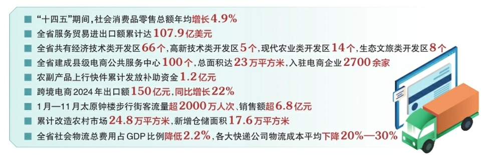 “‘十四五’期間,省商務(wù)廳充分發(fā)揮區(qū)位、資源與產(chǎn)業(yè)優(yōu)勢,出臺對外開放‘1+N’政策體系,發(fā)展外貿(mào)新業(yè)態(tài)新模式,穩(wěn)住了外貿(mào)基本盤?!笔∩虅?wù)廳副廳長李國榮介紹說,包括外向型經(jīng)濟(jì)指標(biāo)穩(wěn)中有進(jìn),全省實際使用外資累計36.8億美元,全省非金融類對外直接投資額累計12.5億美元;開放平臺能級不斷提升,支持武宿綜保區(qū)加快“五大中心”建設(shè),支持山西方略、大同國際陸港、山西蘭花3個保稅物流中心拓展保稅物流、倉儲等功能;開放通道建設(shè)穩(wěn)步推進(jìn),大同、運(yùn)城航空口岸與太原航空口岸共同構(gòu)成“南北一線”的口岸布局。中歐班列提質(zhì)增效,累計開行1048列。出臺鐵海聯(lián)運(yùn)支持政策,形成中鼎物流園—天津港、中鼎物流園—青島港兩條圖定班列。太原國際郵件互換局?jǐn)U容升級項目投入運(yùn)營;開放環(huán)境持續(xù)優(yōu)化,全面推廣山西國際貿(mào)易“單一窗口”平臺應(yīng)用,太原航空口岸列入國家240小時過境免簽政策適用口岸范圍,加大進(jìn)出口信貸等金融支持力度,推動貿(mào)易外匯收支便利化政策擴(kuò)面提質(zhì)。