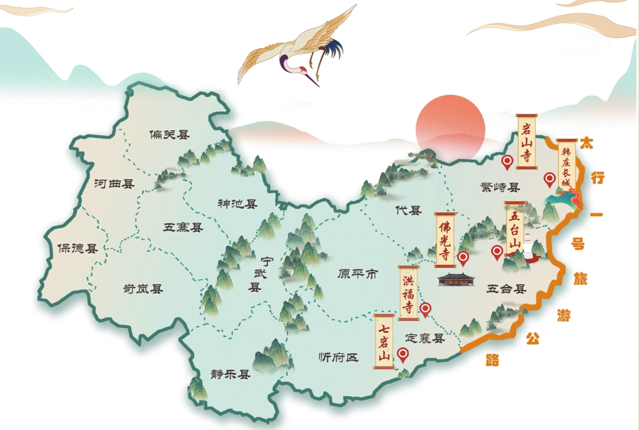 太行一號旅游公路是山西省農(nóng)村道路的重要組成部分,同時(shí)也是打造黃河、長城、太行三大旅游板塊,推進(jìn)鄉(xiāng)村振興的戰(zhàn)略性基礎(chǔ)性工程。沿途貫穿忻州、太原、陽泉、晉中、長治、晉城6市45個(gè)縣(市、區(qū)),聯(lián)通全省122個(gè)A級以上景區(qū)、239個(gè)非A級旅游資源(點(diǎn)),主線已成功入選全國20條“行在鄉(xiāng)村,游在路上”的最美自駕精品路線。旅游公路忻州段起點(diǎn)位于五臺縣韓家樓村,途經(jīng)五臺山風(fēng)景區(qū),終點(diǎn)與繁峙縣平型關(guān)長城一號旅游公路主線相接,全長185公里。
