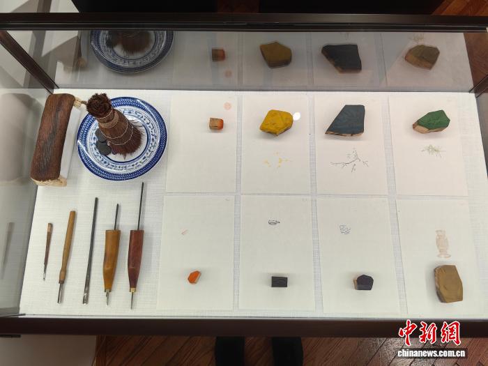 10月13日,中國饾版彩印信箋藝術(shù)展展出制作饾版彩箋的工具。 范宇斌 攝 此次展覽共展出438幅箋品,涵蓋榮寶齋、朵云軒、北京沐版社、天津楊柳青畫社、南京十竹齋、揚(yáng)州廣陵古籍刻印社、成都望江樓博物館七家知名制箋機(jī)構(gòu)的333幅箋品,另有朵云軒復(fù)制的明代《蘿軒變古箋譜》等珍貴箋譜。 展品中,5張宋慶齡定制的饾版彩箋獨(dú)具特色,中西合璧,采用寫意筆法,兼具水彩韻味,色彩強(qiáng)烈,塊面較大,融入英文、蠟燭、圣誕樹等元素,充滿現(xiàn)代與生活氣息,與傳統(tǒng)彩箋形成鮮明對比;北京沐版社創(chuàng)作的饾版彩箋獨(dú)具匠心,如一套以貓為主題的箋紙,構(gòu)圖設(shè)計(jì)突破傳統(tǒng),深受年輕觀眾喜愛。