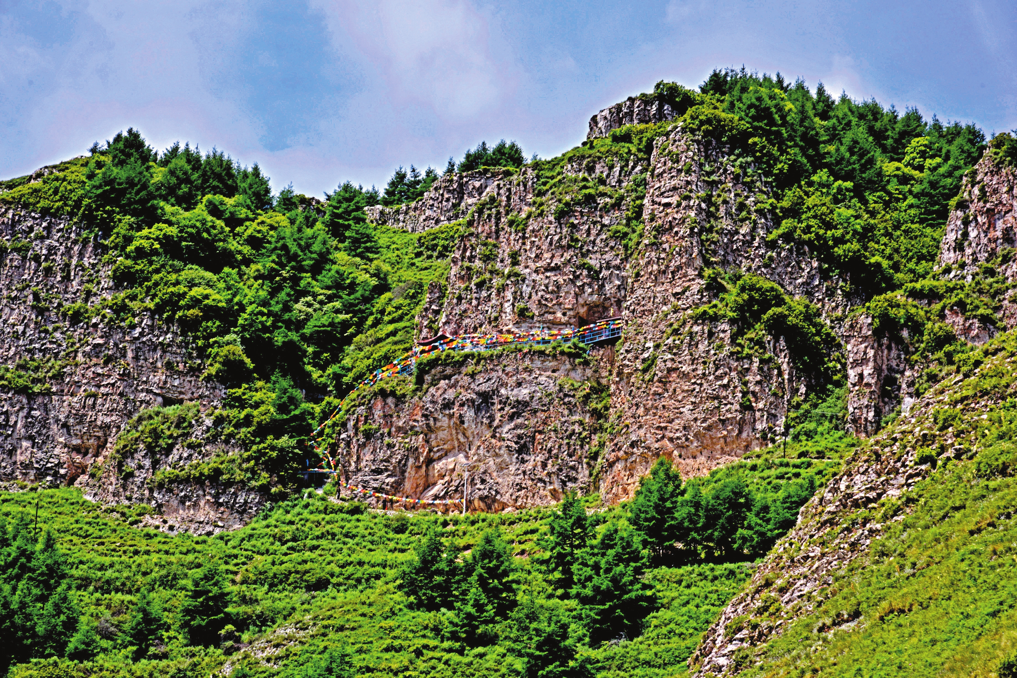 從老君洞主峰下的羊腸小道向前走,可望見(jiàn)峰巒半腰間露出建筑物一角,那便是老君廟了。登臨老君廟,依靠在山的裂縫里開(kāi)鑿出的一條棧道,一腳一蹬,一步一攀,急不得,快不了,就這樣亦步亦趨才能抵達(dá)這座懸在半空的小廟。