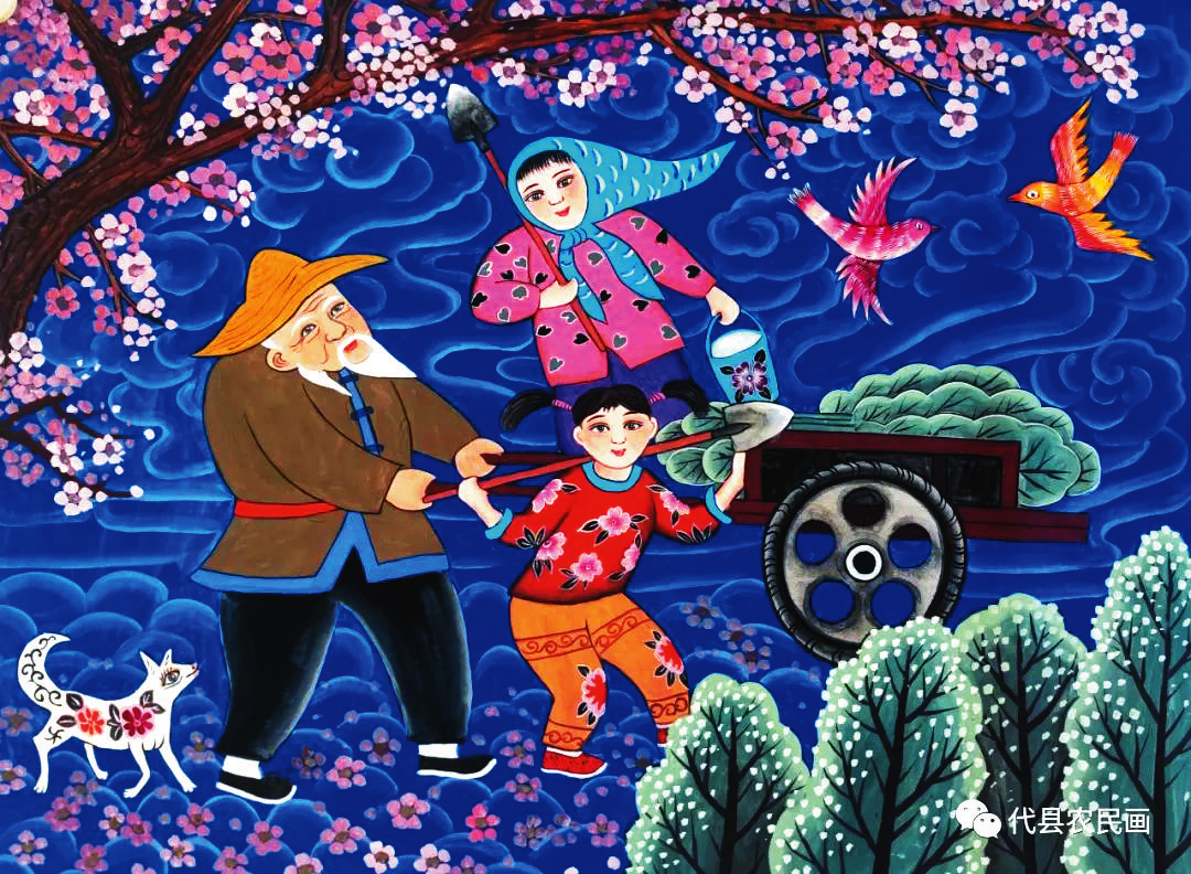 這些雁門巾幗,或是地道的農(nóng)民,或是行政事業(yè)單位、企業(yè)的工作者,或是退休下來的工薪人員,她們深深植根于代縣這方沃土,懷揣著對(duì)藝術(shù)的孜孜追求,不計(jì)名利,克服個(gè)人和家庭的重重困難,利用所有的空閑時(shí)間全身心投入到農(nóng)民畫的創(chuàng)作之中。