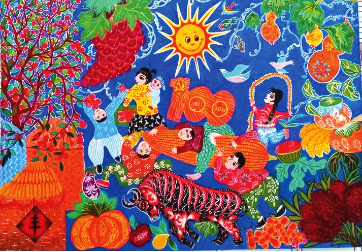 在代縣農(nóng)民畫促進(jìn)會(huì)黨支部和主席團(tuán)的引領(lǐng)下,這些女畫家積極參與促進(jìn)會(huì)組織的各種交流和研討活動(dòng),不斷汲取藝術(shù)養(yǎng)分,深入探索研究農(nóng)民畫的創(chuàng)作技巧,使自己的繪畫技藝逐漸得到提升。她們特別注重借鑒代縣刺繡、面塑、剪紙等民間技藝的創(chuàng)作方法,從各種技藝當(dāng)中吸納有利于農(nóng)民畫創(chuàng)作的元素和營(yíng)養(yǎng)。