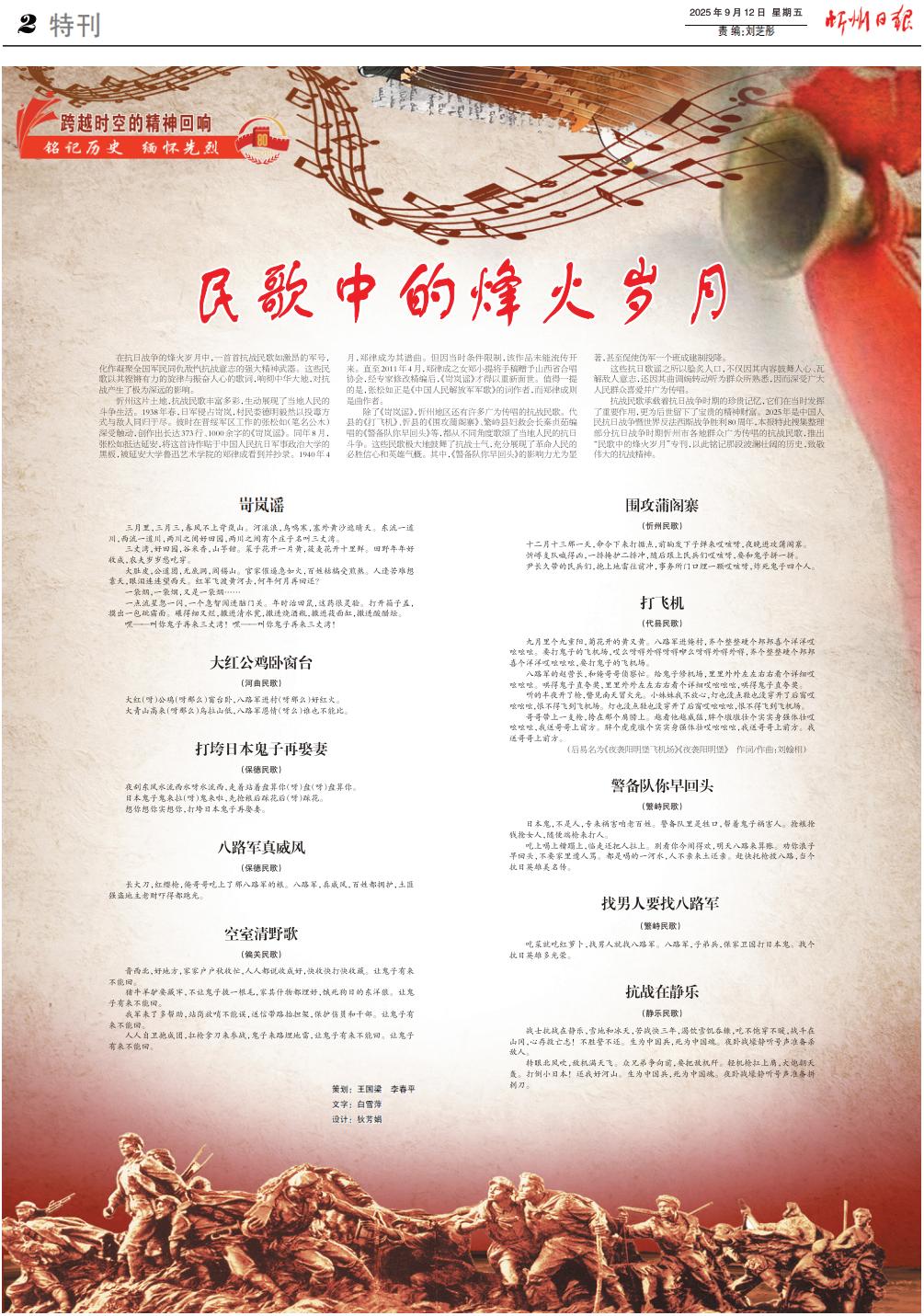 抗戰(zhàn)民歌承載著抗日戰(zhàn)爭時(shí)期的珍貴記憶,它們在當(dāng)時(shí)發(fā)揮了重要作用,更為后世留下了寶貴的精神財(cái)富。2025年是中國人民抗日戰(zhàn)爭暨世界反法西斯戰(zhàn)爭勝利80周年,本報(bào)特此搜集整理部分抗日戰(zhàn)爭時(shí)期忻州市各地群眾廣為傳唱的抗戰(zhàn)民歌,推出“民歌中的烽火歲月”???,以此銘記那段波瀾壯闊的歷史,致敬偉大的抗戰(zhàn)精神。