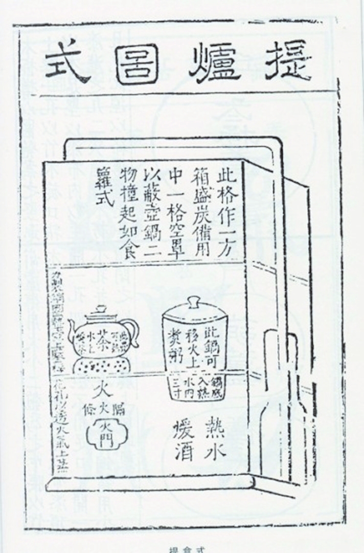 根據(jù)文字與插圖可以看出,提爐的靈感來(lái)自當(dāng)時(shí)普遍使用的“三撞”,即三層式提盒,由可以靈活組裝或分卸的幾部分組成,包括一個(gè)帶有底座的提梁架、兩層方屜盒、一個(gè)四方形圍框,以及一只銅質(zhì)四方形的水火爐。兩層屜盒與四方形圍框在外徑上尺寸一致,且彼此采用子母口套合,可以按照一層屜盒在下、四方形圍框在中、一層屜盒在上的形式疊置,并依靠子母口嵌合牢固。下層方屜盒的外徑尺寸要與提梁架底座上的淺凹槽正好相當(dāng),這樣在移動(dòng)過(guò)程中,屜盒就能牢固嵌置在底座的凹槽內(nèi),不會(huì)脫落。整套配置中最重要的組件是一只小銅火爐,這只銅爐亦為四方形,外徑與下層屜盒的內(nèi)徑相當(dāng),可以恰好放置在屜內(nèi),不會(huì)晃動(dòng)。此爐之所以名為“水火爐”,是因?yàn)闋t體的內(nèi)部用銅板隔為左右兩個(gè)用途不同的區(qū)域,分別發(fā)揮煮水風(fēng)爐與燙酒器的功能。左半部的頂面安有圓形灶,可以放入火炭,在其側(cè)壁上則開(kāi)有火門(mén),用以通風(fēng)、清灰,因此只要將特制的茶壺置于灶上,就可以隨時(shí)生火煮水,沖茶品茗;右半部則僅在頂面開(kāi)有一個(gè)圓口,使用的時(shí)候通過(guò)圓口向內(nèi)注入熱水,然后把一只與圓口大小相配的帶蓋小桶放入其中,再把酒注入小桶,將酒燙熱。小桶是為了組合方便精心設(shè)計(jì)的,還可以擔(dān)任袖珍煮鍋的角色,故《遵生八箋》中稱(chēng)其為“小鑊”。游玩中肚子餓時(shí),還可以隨時(shí)把這只小桶放到灶口上,煮粥或者其他便于快速制作的飲食,就地來(lái)一頓野餐。