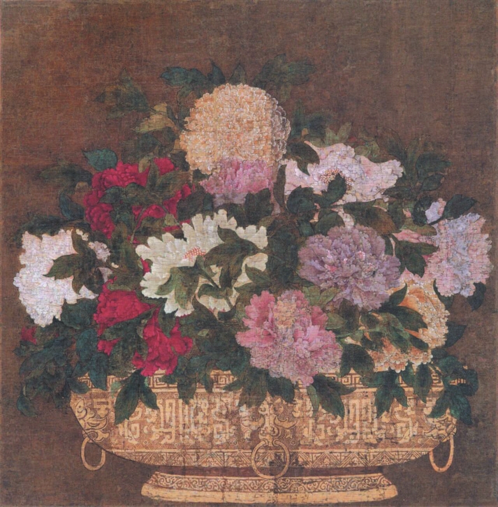 日本知恩院藏有一幅宋代《牡丹圖》,畫(huà)上共12朵盛放的牡丹,尺寸超大,花色各異。盛花器皿是一只類(lèi)似簋的金色青銅器,器形圓滿端莊,紋飾線條飽滿,連拉環(huán)都被畫(huà)成滿圓,材質(zhì)似為青銅,也可能是金?;ǘ洳宸排c花器呈“品”字偏圓形布局。細(xì)密的絹絲雖已襤褸,但其靜穆而雍容華貴的氣質(zhì)仍令人震撼——它是傳世牡丹圖中最令人印象深刻的一幅。