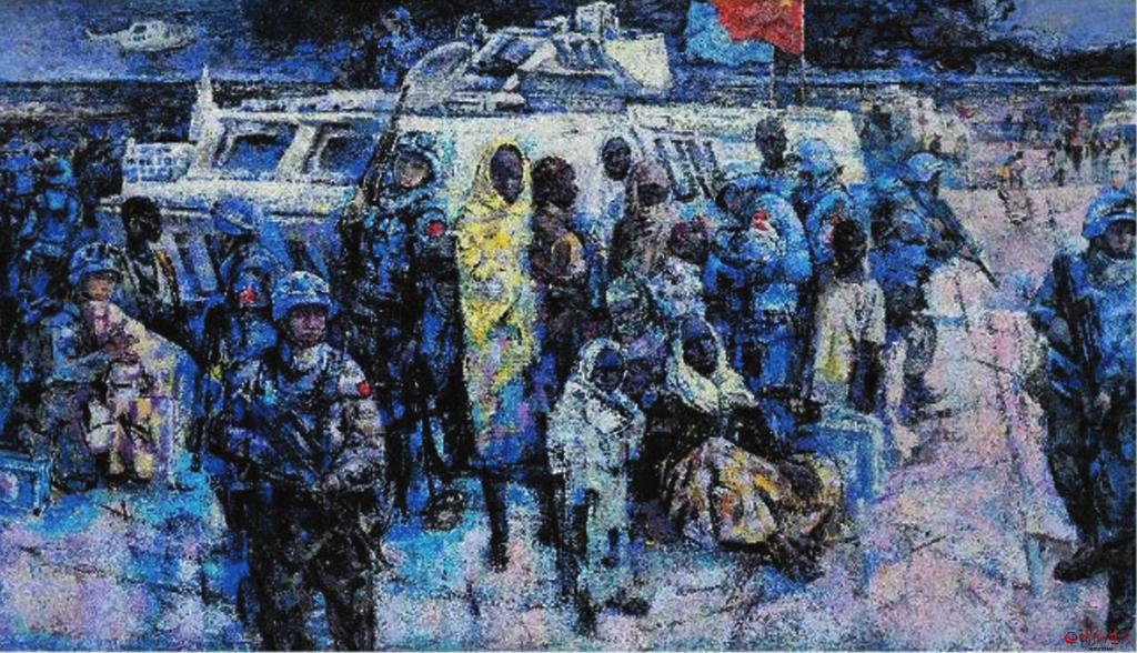 在續(xù)鶴賢眾多的作品中,從畫面表現(xiàn)效果方面,我是比較喜歡《和平使命——藍(lán)色交響曲》這幅作品的。無論畫面構(gòu)圖、色彩關(guān)系,還是人物造型以及表現(xiàn)技巧,都堪稱完美。畫面中無論人物形象、動態(tài)、表情,還是人與自然背景,都處在一種和諧美好的關(guān)系中,從一個新的角度給予美好詮釋。這幅作品表現(xiàn)的是我們的維和部隊“子弟兵”以自己的生命守護著世界和平,講述著構(gòu)建人類命運共同體的大國情懷。 (邢晨聲 文)