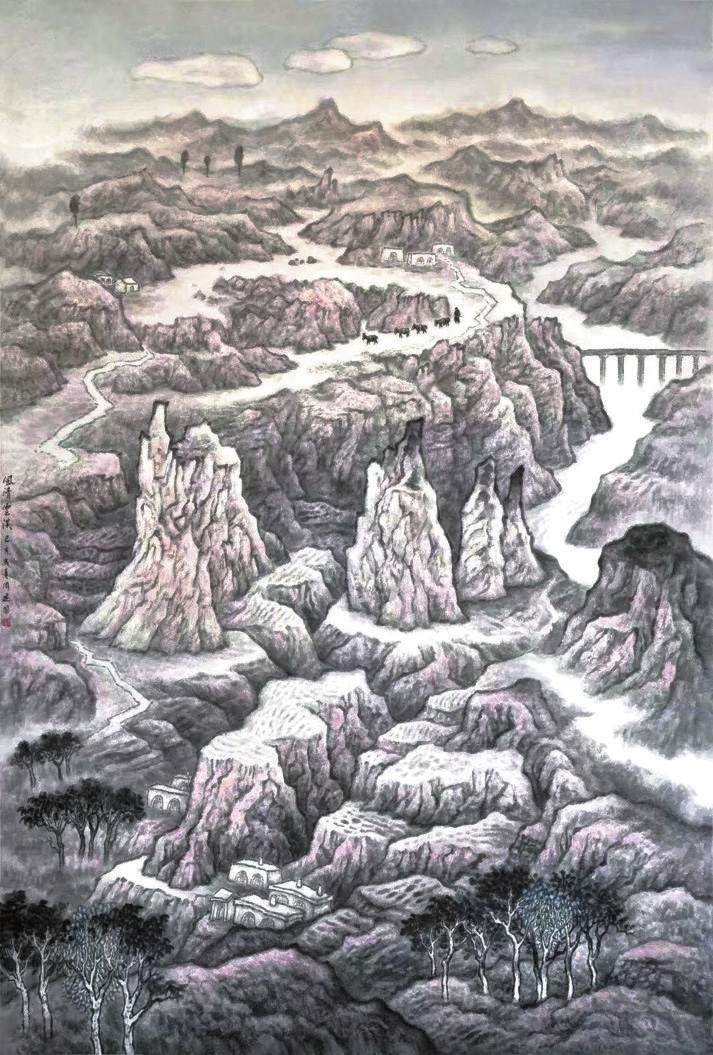 周建國對中國山水畫有著獨特見解,出版過畫集《中國美術(shù)名家精品鑒賞·周建國作品集》。他的創(chuàng)作之路主要分為兩個時期,前期追求中西融合,后期則回歸傳統(tǒng)。前期作品《曉月》《古原除夕》《月色》等,多取材于黃土高原,真切流露出其對黃土地的深情厚愛:早上飄起的炊煙演繹著百姓的勤勞,喧鬧的腰鼓彰顯著鄉(xiāng)民熱愛生活的豪情,晨起上課的學(xué)生更是承載著當(dāng)?shù)厝藵M滿的希望。周建國將黃土地上的一草一木皆升華為獨特且富有個性的生命體,畫面處理側(cè)重將西方油畫的光影巧妙融入作品,寓動于靜,動靜相宜,彰顯“高貴的單純,靜穆的偉大”的內(nèi)在張力。同時將傳統(tǒng)山水繪畫的造型、空間結(jié)構(gòu)、筆法設(shè)色皆進行改變——黃土溝壑的幾何化處理、筆墨色調(diào)的反復(fù)拿捏、耐人尋味的空間布局,都體現(xiàn)了其特殊的創(chuàng)作理念。相較前期,周建國后期的作品更加注重對內(nèi)在美的挖掘,如《風(fēng)月同天》《家園》《和諧家園》《生息之地》《太行月色》等代表作品,表達對祖國山河大川的熱愛,走“外師造化,中得心源”之道,畫風(fēng)趨向率真,試圖突破中國山水繪畫的表象審美,追尋深層意義的表達。