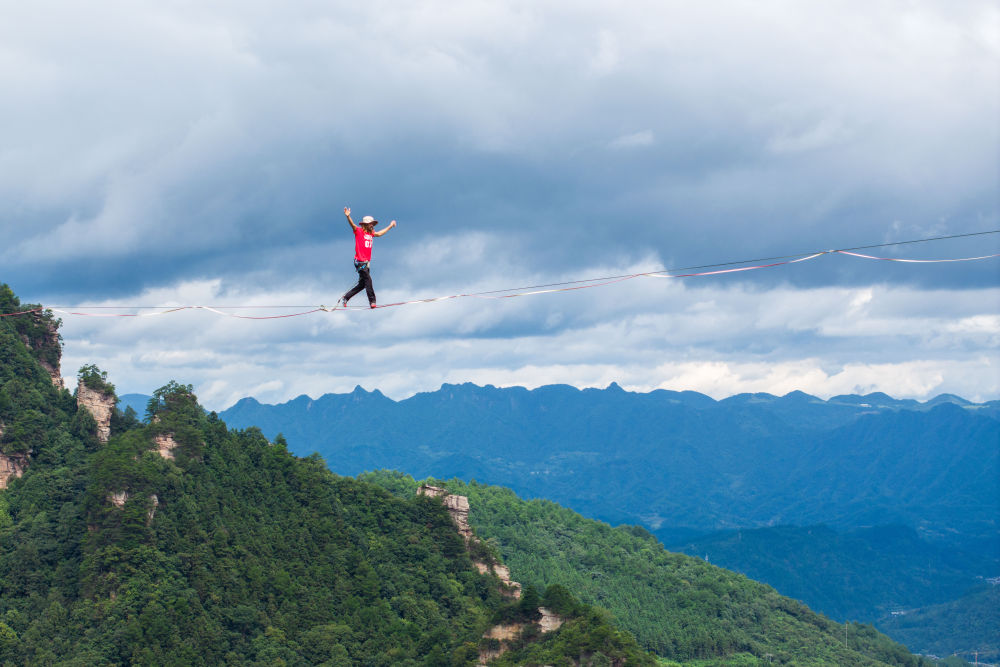 比賽時,選手們系上安全繩后,從懸崖邊起步,走上一指多寬、約2毫米厚的扁帶。按照比賽規(guī)則,選手需在3次掉落次數(shù)內完成1000米距離行走,用時最短者獲勝。