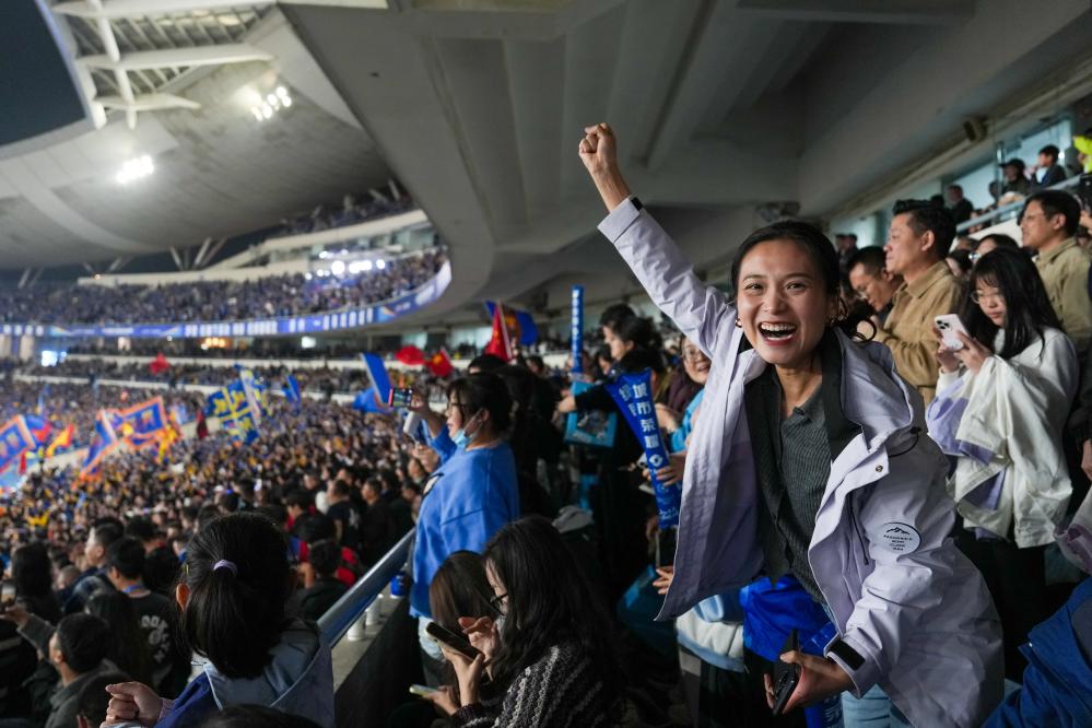 11月1日,一名球迷在看臺(tái)為雙方球隊(duì)加油。新華社記者 李博 攝