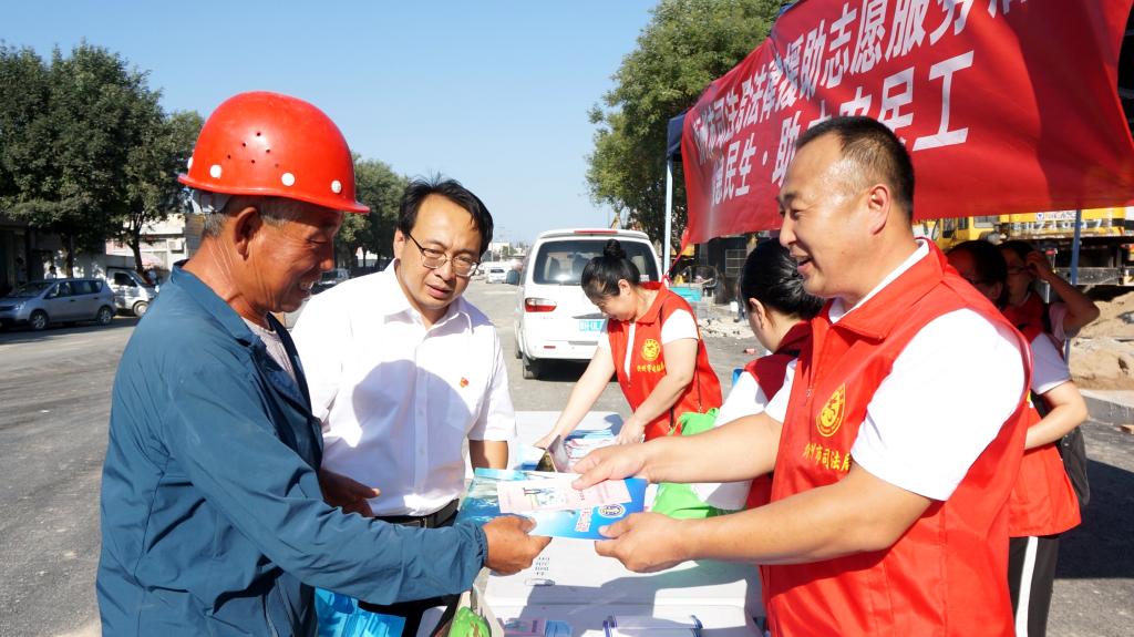 為深入貫徹落實習(xí)近平新時代中國特色社會主義思想和黨的十九大及十九屆二中、三中、四中全會精神,貫徹落實《保障農(nóng)民工工資支付條例》和國家、山西省關(guān)于農(nóng)民工服務(wù)工作的部署,切實加強我市農(nóng)民工安全生產(chǎn)意識,提高農(nóng)民工的維權(quán)意識和維權(quán)能力,8月13日下午,忻州市司法局組織市法律援助中心、公證處、律師事務(wù)所、司法鑒定中心組成法律援助志愿服務(wù)隊,走進忻州古城建筑工地現(xiàn)場,開展了“法援惠民生·助力農(nóng)民工”法律援助志愿服務(wù)活動。