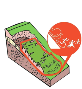 2.坡下行人如遇崩塌應(yīng)向崩塌體下方的兩側(cè)方向迅速逃離。一定不要順著滾石方向撤離,注意保護(hù)頭部。