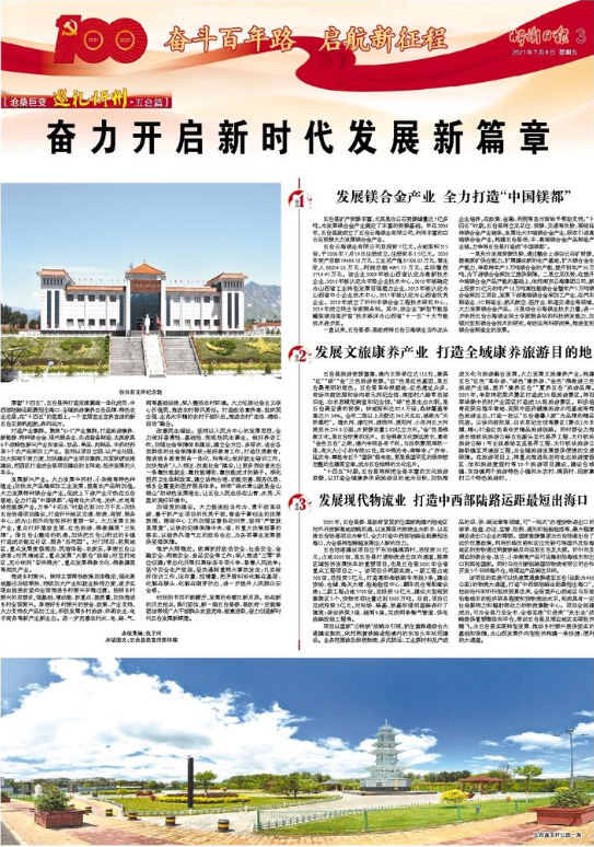展望“十四五”,五臺縣將打造京津冀雄一體化成員、中西部陸路運距最短出??凇⑷蚵糜慰叼B(yǎng)五臺品牌、特色農(nóng)業(yè)名縣,在“十四五”的藍圖上,一個宜居宜業(yè)宜養(yǎng)宜游的新五臺正揚帆起航,奔向遠方。 打造產(chǎn)業(yè)集群。聚焦“6+5”產(chǎn)業(yè)集群,打造旅游康養(yǎng)、新能源、特種鎂合金、現(xiàn)代服務(wù)業(yè)、先進裝備制造、古典家具6個戰(zhàn)略性新興產(chǎn)業(yè)和食品、飲品、果品、肉制品、中藥材藥茶5個農(nóng)產(chǎn)品深加工產(chǎn)業(yè)。堅持以項目立園、以產(chǎn)業(yè)壯園,加大招商引資力度,加快建設(shè)產(chǎn)業(yè)項目集群,加緊軟硬設(shè)施建設(shè),把園區(qū)打造成全縣項目建設(shè)的主陣地、經(jīng)濟發(fā)展的火車頭。 發(fā)展新興產(chǎn)業(yè)。大力發(fā)展中藥材、小雜糧等特色種植業(yè);加快農(nóng)產(chǎn)品精深加工業(yè)發(fā)展,提高農(nóng)產(chǎn)品附加值。大力發(fā)展特種鎂合金產(chǎn)業(yè),促成上下游產(chǎn)業(yè)盡快在五臺落地,全力打造“中國鎂都”;培育壯大風(fēng)電、光伏、水電等綠色能源產(chǎn)業(yè),力爭“十四五”時期達到200萬千瓦;加快五臺陸港項目建設(shè),打造忻州地區(qū)交通、物流、商貿(mào)、服務(wù)中心,成為山西外向型經(jīng)濟的重要一環(huán)。大力發(fā)展文旅產(chǎn)業(yè),重點打好清涼宜居、紅色旅游、佛教建筑“三張牌”。借五臺山整治的機遇,加快把五臺山附近的鄉(xiāng)鎮(zhèn)打造成功能互補區(qū)、服務(wù)“后花園”。對門限石、駝梁地區(qū),重點發(fā)展度假酒店、民宿體驗、農(nóng)家樂,承接五臺山游客;對靈境地區(qū),重點發(fā)展“大朝臺”線路;對豆村地區(qū),充分依托“亞洲佛光”,重點發(fā)展佛教文化、佛教建筑等相關(guān)產(chǎn)業(yè)。 推進鄉(xiāng)村振興。保持主要幫扶政策總體穩(wěn)定,強化易地搬遷后續(xù)幫扶,持續(xù)加大產(chǎn)業(yè)和就業(yè)扶持力度,逐步實現(xiàn)由脫貧攻堅向全面推進鄉(xiāng)村振興平穩(wěn)過渡。按照鄉(xiāng)村振興的總要求,強基礎(chǔ)、增動能、抓重點、提質(zhì)量,加快推進鄉(xiāng)村全面振興。承接好鄉(xiāng)村振興的資金、政策、產(chǎn)業(yè)支持,大力支持農(nóng)產(chǎn)品加工業(yè),積極發(fā)展鄉(xiāng)村旅游、休閑農(nóng)業(yè)、電子商務(wù)等新產(chǎn)業(yè)新業(yè)態(tài)。進一步完善農(nóng)村水、電、路、氣、網(wǎng)等基礎(chǔ)設(shè)施,深入整治農(nóng)村環(huán)境。大力弘揚社會主義核心價值觀,推進農(nóng)村移風(fēng)易俗。打造政治素養(yǎng)高、組織觀念強、業(yè)務(wù)水平精的農(nóng)村干部隊伍,推進農(nóng)村“法治、德治、自治”融合。 改善民生福祉。堅持以人民為中心的發(fā)展思想,全力做好普惠性、基礎(chǔ)性、兜底性民生事業(yè)。做好養(yǎng)老工作,加強社會保障體系建設(shè),建立全方位、多層次、適合各類群體的社會保障系統(tǒng);做好教育工作,打造優(yōu)質(zhì)教育,推進城鄉(xiāng)教育服務(wù)一體化、均等化;做好就業(yè)培訓(xùn)工作,加快推進“人人持證、技能社會”建設(shè),讓更多勞動者走出一條靠技能就業(yè)、靠技能增收、靠技能成才的路子。深化醫(yī)藥衛(wèi)生體制改革,建立結(jié)構(gòu)合理、功能完善、服務(wù)優(yōu)質(zhì)、城鄉(xiāng)全覆蓋的醫(yī)療服務(wù)體系。樹牢“綠水青山就是金山銀山”的綠色發(fā)展理念,讓五臺人民生活在山青、水秀、天藍的美好環(huán)境中。 加強黨的建設(shè)。大力提拔擔(dān)當(dāng)作為、勇于改革突破、善于抓產(chǎn)業(yè)項目的優(yōu)秀干部,營造干事創(chuàng)業(yè)的濃厚氛圍。圍繞中心工作加強監(jiān)督執(zhí)紀(jì)問責(zé),堅持“嚴(yán)管就是厚愛”,以鐵的紀(jì)律保障中央、省、市重大決策部署的落實,以涵養(yǎng)風(fēng)清氣正的政治生態(tài),為各項事業(yè)發(fā)展提供堅強保障。 維護大局穩(wěn)定。統(tǒng)籌抓好政治安全、社會安全、金融安全、網(wǎng)絡(luò)安全、食品安全等工作;深入推進“三零”單位創(chuàng)建;常態(tài)化開展掃黑除惡專項斗爭、禁毒人民戰(zhàn)爭;堅守安全生產(chǎn)底線,堅決遏制重特大事故發(fā)生;扎實做好信訪工作,壓存量、控增量,把矛盾糾紛化解在基層、化解在源頭、化解在萌芽狀態(tài),進一步提升人民群眾安全感。 時間的書頁不斷翻開,發(fā)展的命題日新月異。站在新的歷史起點,我們堅信,新一屆五臺縣委、縣政府一定能夠團結(jié)帶領(lǐng)廣大干部群眾攻堅克難、銳意進取,奮力創(chuàng)造新時代五臺發(fā)展新輝煌。(五臺縣委宣傳部) 發(fā)展鎂合金產(chǎn)業(yè) 全力打造“中國鎂都”五臺縣礦產(chǎn)資源豐富,尤其是白云石資源儲量達7億多噸,為發(fā)展鎂合金產(chǎn)業(yè)奠定了豐富的資源基礎(chǔ)。早在2006年,五臺縣就成立了五臺云海鎂業(yè)有限公司,利用豐富的白云石資源大力發(fā)展鎂合金產(chǎn)業(yè)。 五臺云海鎂業(yè)有限公司總投資7億元,占地面積315畝,于2006年7月19日注冊成立,注冊資本1.5億元。2020年資產(chǎn)總額79686.10萬元,工業(yè)總產(chǎn)值87306.03萬元,營業(yè)收入88214.10萬元,利潤總額4991.73萬元,實際繳稅3714.45萬元。該企業(y