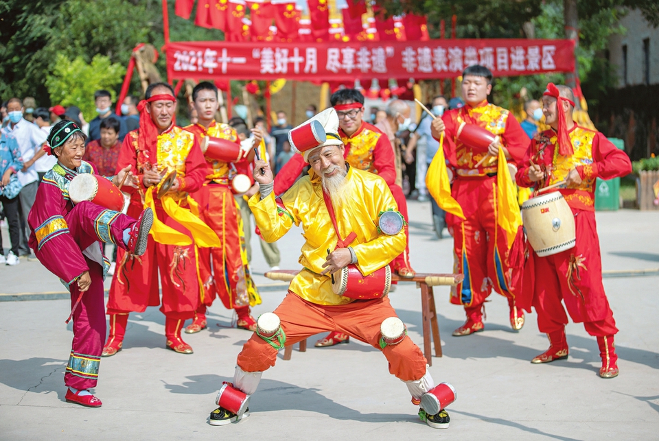 10月2日,民間藝人在鹽湖區(qū)東郭鎮(zhèn)嵐山根景區(qū)表演國家級非遺“萬榮花鼓”。國慶長假期間,運(yùn)城市鹽湖區(qū)東郭鎮(zhèn)嵐山根景區(qū)在做好疫情防控的同時,推出“非遺進(jìn)景區(qū)”、蒲劇展演等豐富多彩的民俗活動,吸引了眾多游客前來游玩。(閆鑫攝)