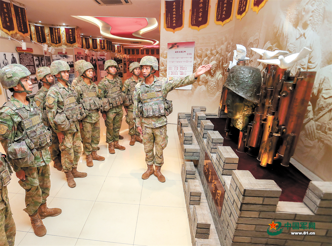 “硬骨頭六連”黨員骨干為新戰(zhàn)友講述“硬骨雄風(fēng)”雕塑背后的故事。李彬攝 嶺南腹地,沙場鏖兵。前不久,“硬骨頭六連”官兵整裝出發(fā),一場實兵演練拉開戰(zhàn)幕。數(shù)十名全副武裝的官兵,沖上5米高的障礙墻,縱身躍入深3米的反坦克壕,隨即在火網(wǎng)中穿越、在泥潭中匍匐、在躍進中爆破,徒手攀上近90度的險峻懸崖,滑越過百米山澗,展開快速突擊…… 曾經(jīng)在連隊?wèi)?zhàn)斗和工作過的老領(lǐng)導(dǎo)、老戰(zhàn)士被官兵們請回“娘家”,看到這一幕演練情景時難掩激動:“還是當(dāng)年那股勁,還是當(dāng)年的‘硬骨頭’!”