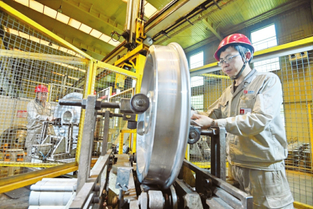 車輪廠二線檢測工部檢查工正在逐片對車輪進(jìn)行目檢。