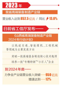 省工信廳日前發(fā)布《山西省高端裝備制造產(chǎn)業(yè)鏈2024年行動計劃》,確立年度推進(jìn)目標(biāo):以軌道交通、智能煤機、工程機械等領(lǐng)域為主要發(fā)展方向,突破一批高端裝備制造核心技術(shù)瓶頸,培養(yǎng)一批“專精特新”“小巨人”企業(yè),提升全產(chǎn)業(yè)鏈科技創(chuàng)新能力,強化高端裝備制造供應(yīng)鏈穩(wěn)定性和配套能力。并提出,到2024年底,力爭全產(chǎn)業(yè)鏈營業(yè)收入突破950億元,增速達(dá)到12%。