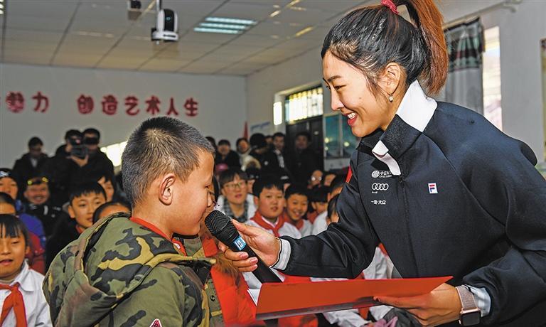 徐夢桃(右)在內(nèi)蒙古阿爾山市白狼鎮(zhèn)白狼小學(xué)為當(dāng)?shù)匦W(xué)生普及滑雪知識(shí)(二〇一八年十二月攝)。新華社記者 劉 磊攝