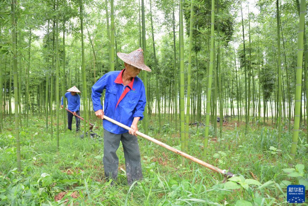 農(nóng)戶(hù)在福建省建甌市井岐村一處雷竹林里鋤草(6月8日攝)。新華社記者 張華迎 攝