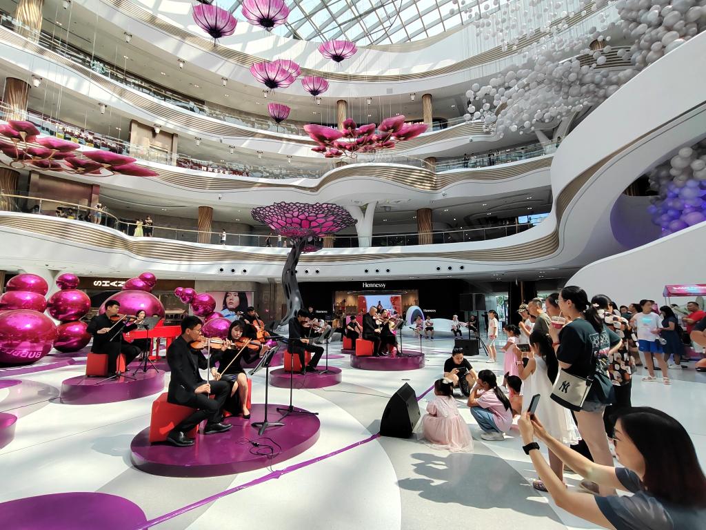 端午假期,??趪H免稅城內(nèi),伴隨著悠揚的音樂,陽光傾瀉“天際秘林”夢幻舞臺,正在購物的游客們紛紛駐足欣賞?!耙粓鍪覂?nèi)音樂會,給購物消費增添了新意和氛圍感?!焙?谑忻耜惱俪两陉柟夂鸵魳分小?/p>