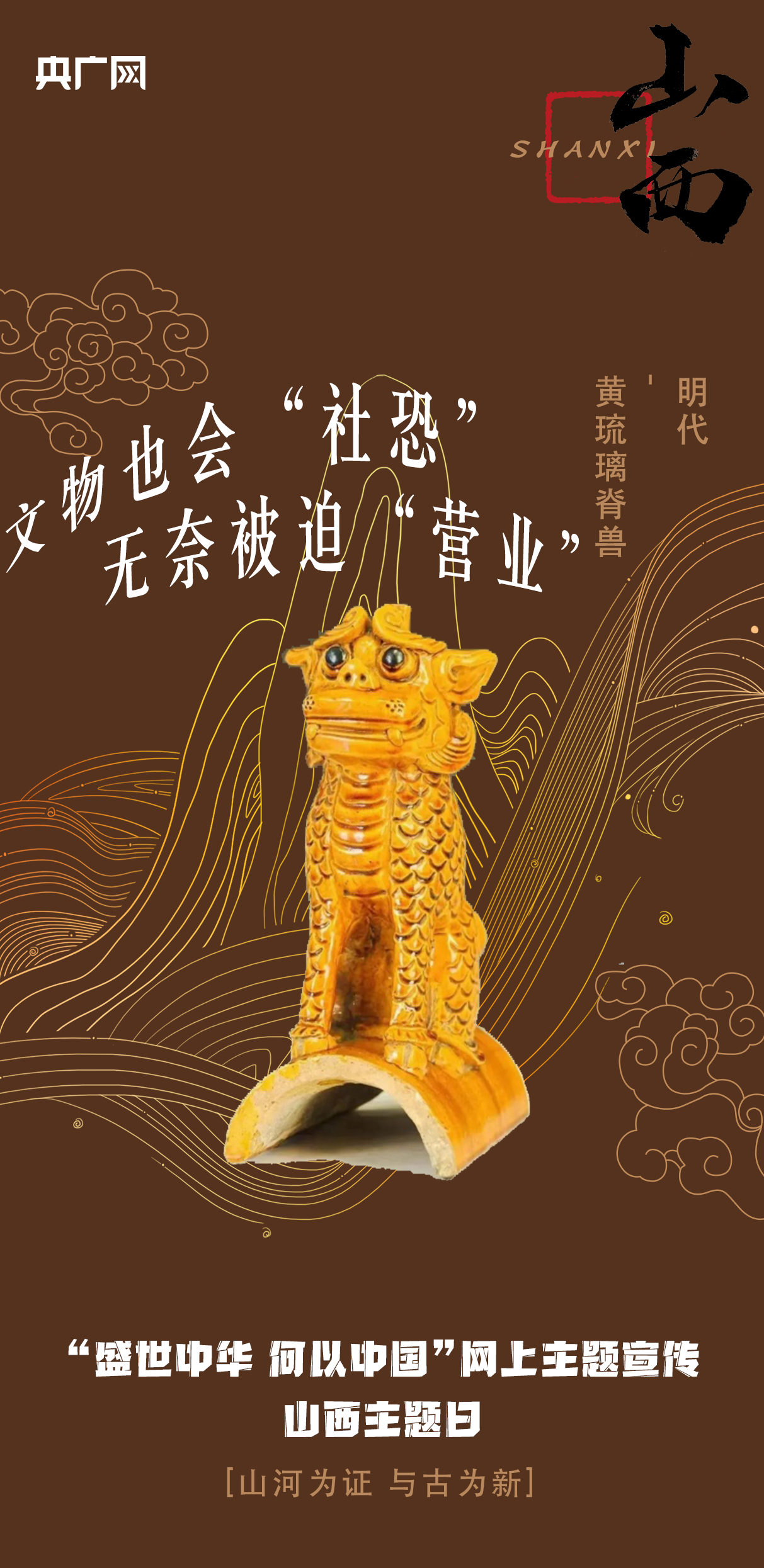 明代黃琉璃脊獸。由山西晉中介休文化館于1984年9月移交至介休博物館收藏保護(hù)。琉璃走獸高31.7厘米,通體金黃,色澤飽滿,形態(tài)逼真,流光溢彩。因眉頭緊皺,瞪圓雙眼的呆萌表情,被網(wǎng)友戲稱(chēng)為“未成年文物”。