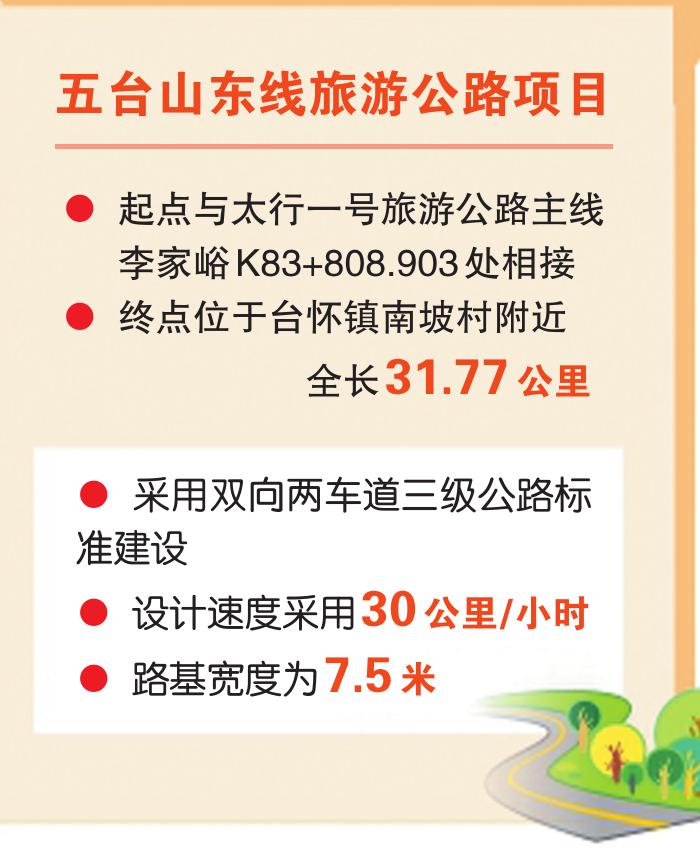 五臺(tái)山東線旅游公路起點(diǎn)與太行一號(hào)旅游公路主線李家峪K83+808.903處相接,終點(diǎn)位于臺(tái)懷鎮(zhèn)南坡村附近,全長31.77公里,采用雙向兩車道三級(jí)公路標(biāo)準(zhǔn)建設(shè),設(shè)計(jì)速度采用30公里/小時(shí),路基寬度為7.5米。項(xiàng)目實(shí)施圍繞“扶貧、旅游、生態(tài)、人文、研學(xué)”等核心宗旨,著力提升五臺(tái)山風(fēng)景名勝區(qū)旅游公路的通行能力與服務(wù)水平,強(qiáng)化“交通+旅游”與“經(jīng)濟(jì)增長”的導(dǎo)向作用。