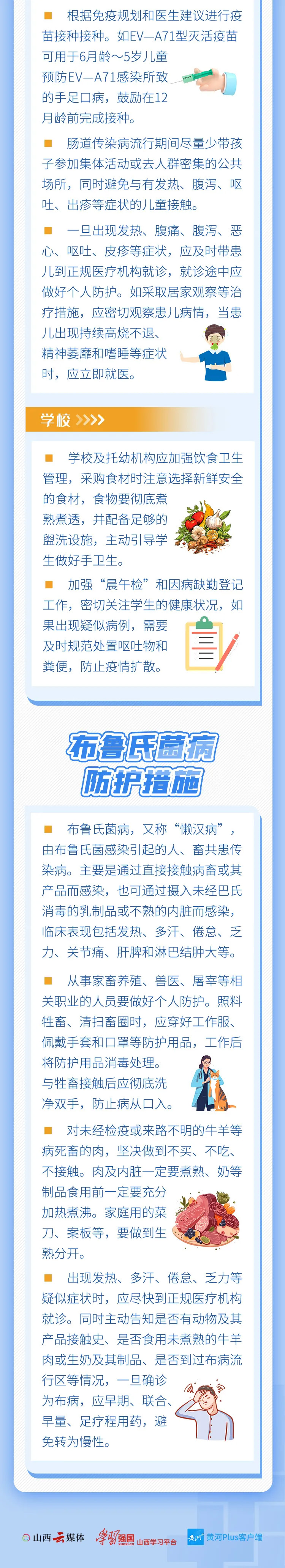 山西省疾病預(yù)防控制中心專家組介紹,我省新型冠狀病毒感染呈現(xiàn)緩慢上升趨勢,流行性感冒呈現(xiàn)波動流行趨勢,百日咳超過既往同期水平,水痘、猩紅熱等呼吸道傳染病疫情存在波動,手足口、諾如病毒所致的感染性腹瀉等腸道傳染病將進入高發(fā)季,布魯氏菌病等人畜共患傳染病風險增加,全省春季傳染病疫情呈現(xiàn)多種傳染病交替或共同流行態(tài)勢。