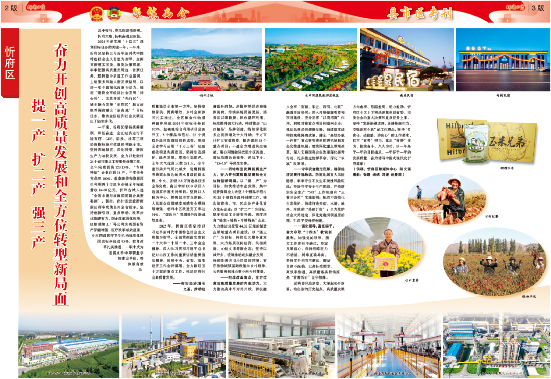 一年來,忻府區(qū)堅持統(tǒng)籌兼顧、承壓奮進,全區(qū)經(jīng)濟運行平穩(wěn)有序,GDP、固投、社零三項經(jīng)濟指標絕對值繼續(xù)領(lǐng)跑全市。堅持因地制宜、深化轉(zhuǎn)型,新質(zhì)生產(chǎn)力加快發(fā)展,全力以赴做好24個省市重點工程服務保障工作,全年完成投資123.15%,“專精特新”企業(yè)達到18戶,年度任務完成率100%,溫泉康養(yǎng)和資源再生利用兩個市級專業(yè)鎮(zhèn)全年完成營收14.68億元,忻州古城入選“全省非遺與旅游深度融合典型案例”,頓村、奇村省級旅游度假區(qū)評審成績名列全省前茅。堅持創(chuàng)新引領(lǐng)、重點帶動,改革步伐穩(wěn)健有力,國企改革深化拓展,區(qū)糧油加工廠等公司實現(xiàn)國有資產(chǎn)保值增值,醫(yī)療改革成效顯著,鄉(xiāng)村兩級醫(yī)療衛(wèi)生機構(gòu)標準化建設達標率超過95%,教育改革扎實推進,一職中成為省高水平中等職業(yè)學校建設單位,整體教育教學質(zhì)量穩(wěn)居全市第一方陣。堅持穩(wěn)糧保供、提質(zhì)增效,鄉(xiāng)村全面振興扎實推進,全區(qū)糧食作物播種面積完成2024年指標任務的105%,鹽堿地綜合利用項目全面開工,5個精品示范村、22個提檔升級村取得階段性成效,榮獲全省學習運用“千萬工程”經(jīng)驗成效明顯先進市縣。堅持生態(tài)保護、綠色發(fā)展,厚植生態(tài)底色,全年大氣優(yōu)良天數(shù)281天,全年重污染天氣同比減少,定襄橋國考斷面水質(zhì)達地表水Ⅲ級優(yōu)良水質(zhì),中央、省級2.8萬畝造林任務全部完成,南云中河EOD項目入選國家示范支持項目。堅持以人民為中心、積極回應群眾期盼,人民群眾獲得感幸福感安全感持續(xù)增強,老舊小區(qū)改造完工率達91%,“煤改電”鞏固提升改造成效顯著。